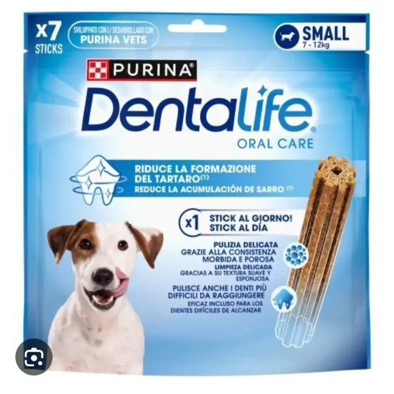Tu perro tiene unas necesidades de salud específicas y el mantenimiento de un cuidado oral saludable contribuye positivamente a su bienestar general. Es por eso que los expertos de Purina® han desarrollado Purina® DentaLife®, un innovador masticable dental científicamente demostrado que ayuda a limpiar incluso los dientes de difícil alcance de la parte posterior, que son los más vulnerables a la acumulación de placa y sarro. Nuestros masticables dentales están diseñados para el uso y masticación diaria, significando más tiempo de limpieza. Empieza hoy la rutina diaria de cuidado oral de tu perro. Limpia incluso los dientes difíciles de alcanzar; científicamente probado que reduce la acumulación de sarro y ayuda a reducir la acumulación de placa Sin colorantes ni aromatizantes artificiales añadidos. Con sabroso pollo Vitamina D & Calcio para dientes fuertes Sin azúcares añadidos Bajo en grasas Ingredientes nutritivos Composición: Cereales (60% harina de maíz extrudida, 5% harina de trigo), Glicerol, Sustancias minerales, Levaduras, Carnes y subproductos animales (1,2%), Aceites y grasas. equivalente a 4% carnes y subproductos animales rehidratados (4% pollo). Aditivos nutricionales: UI/kg: Vitamina A: 8500, Vitamina D3: 570, Vitamina E: 60. mg/kg: Yodato de calcio anhidro: 2,2; Sulfato manganoso monohidratado: 12,5; Sulfato de zinc monohidratado: 280; Selenito de sodio: 0,31. Con antioxidantes. Componentes analíticos: Humedad: 14,5%; Proteína bruta: 7,0%; Aceites y grasas brutos: 2,5%; Ceniza bruta: 4,5%; Fibras brutas: 0,7%; Calcio: 1,1%
