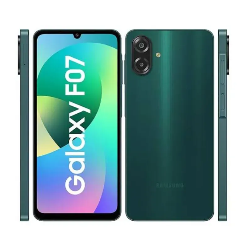 El Samsung Galaxy F07 tiene una pantalla HD+ de 6.7 pulgadas con tasa de refresco de 90Hz y está potenciado por un procesador Helio G99 con 4GB de RAM y 64GB de almacenamiento interno. Su cámara dual es de 50MP, tiene una batería de 5000 mAh de carga rápida, resistencia a salpicaduras, lector de huellas y corre Android 15.