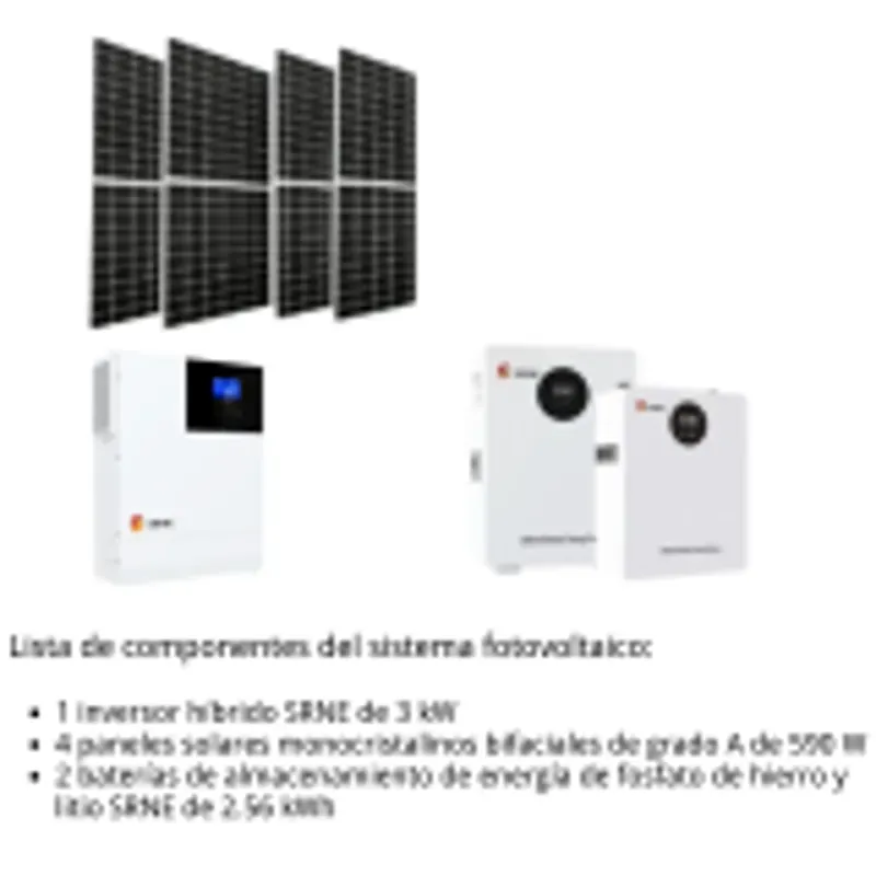 Equipado con un inversor híbrido de 3 kW y una batería de fosfato de hierro y litio SRNE de 5.12 kWh (que genera más de 500 kWh por mes), escalable