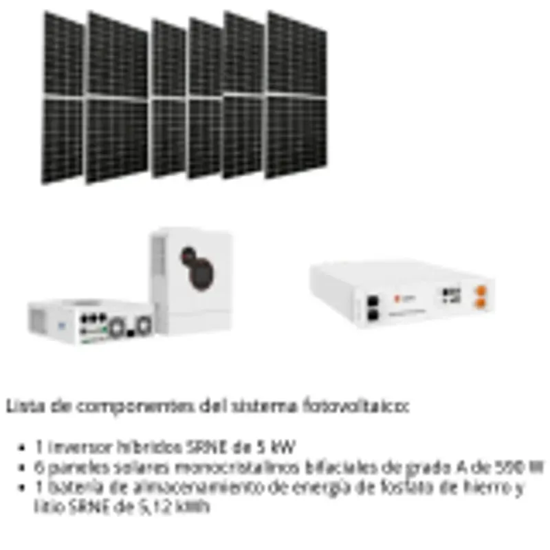 Equipado con un inversor híbrido SRNE de 5 kW y una batería de fosfato de hierro y litio SRNE de 5.12 kWh, con una generación mensual superior a 550 kWh, e