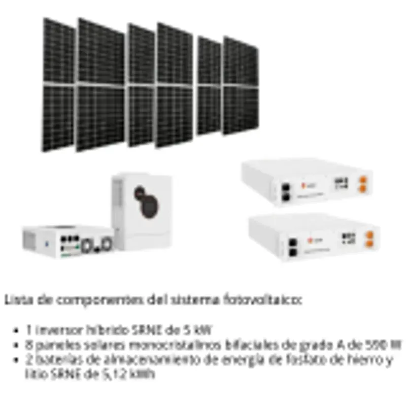 Equipado con un inversor híbrido de 5 kW y una batería de fosfato de hierro y litio SRNE de 10 kWh (que genera más de 1020 kWh por mes), escalable
