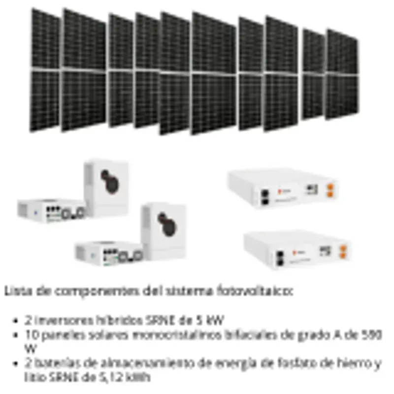 Equipado con dos inversores híbridos de 5 kW y dos baterías de fosfato de hierro y litio SRNE de 5,12 kWh (que generan más de 1200 kWh por mes), escalable.
