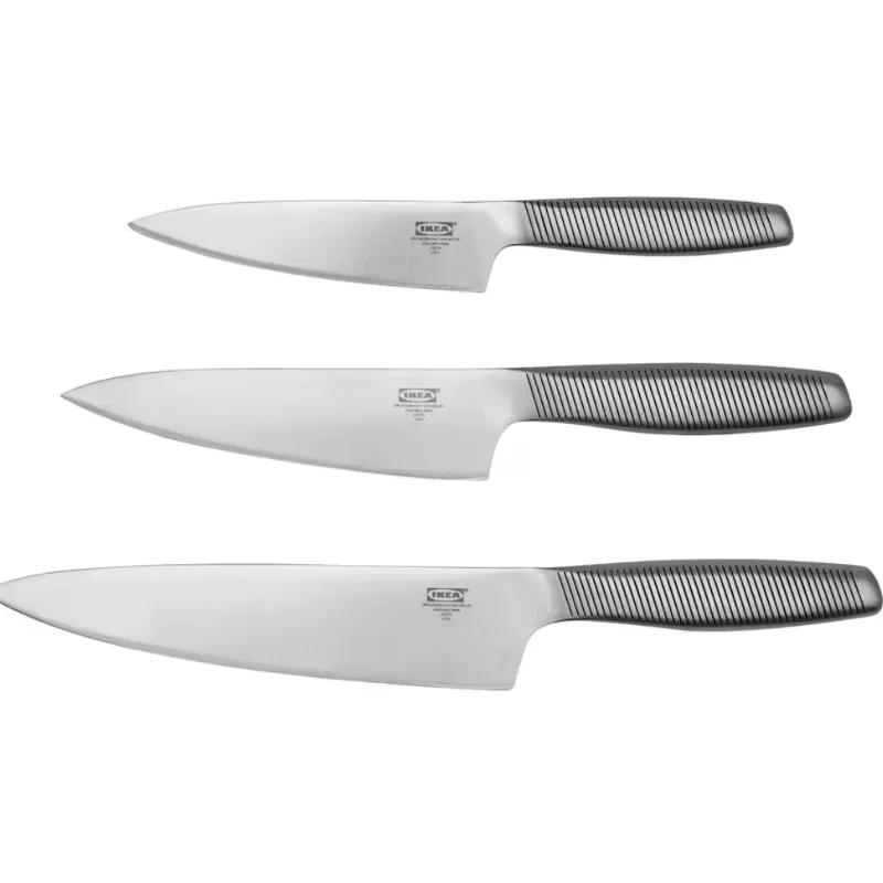 Son cuchillos de acero de molibdeno/vanadio se mantienen afilados mucho tiempo. Incluye: 1 cuchillo multiusos de 14 cm, (L total 25 cm), 1 cuchillo del chef de 16 cm, (L total 29 cm) y 1 cuchillo del chef de 20 cm, (L total 33 cm).