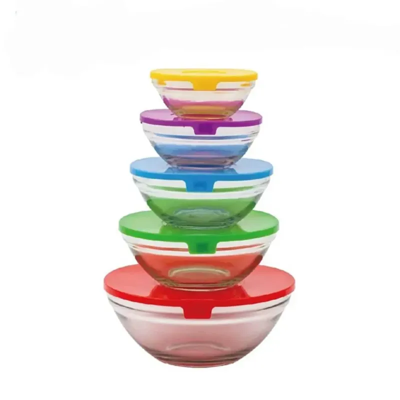 5 Juego de tazones de vidrio apilables de 1 pieza. Apto para microondas, lavavajillas y refrigerador. Perfectos para guardar sobras, mezclar o preparar deliciosas salsas. Tapas de plástico acanaladas que cierran de forma segura. Los tazones apilables facilitan su almacenamiento. Tazones de 130ml, 200 ml, 350 ml , 500 ml y 950 ml.