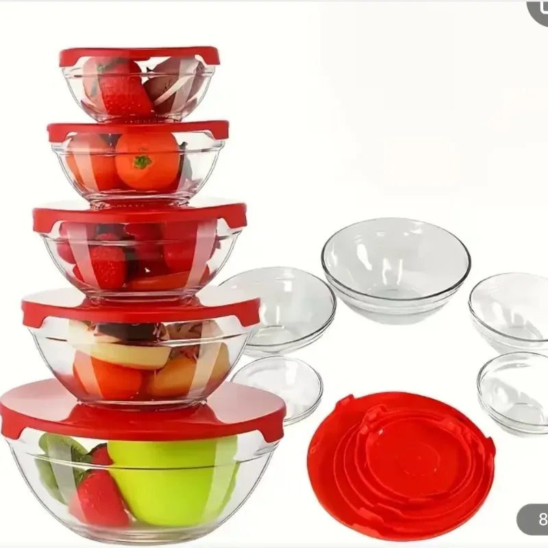 5 Juego de tazones de vidrio apilables de 1 pieza. Apto para microondas, lavavajillas y refrigerador. Perfectos para guardar sobras, mezclar o preparar deliciosas salsas. Tapas de plástico acanaladas que cierran de forma segura. Los tazones apilables facilitan su almacenamiento. Tazones de 130ml, 200 ml, 350 ml , 500 ml y 950 ml.