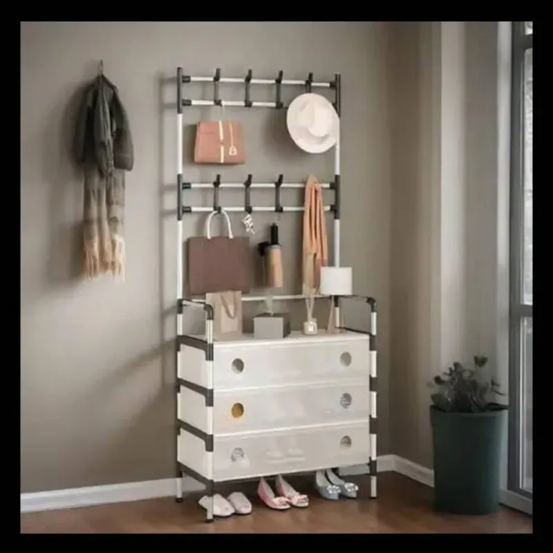 Perchero y zapatero de 3 niveles con funda antipolvo, organizador multifuncional para recibidor con 10 ganchos, resistente zapatero de metal para casa, pasillo y dormitorio