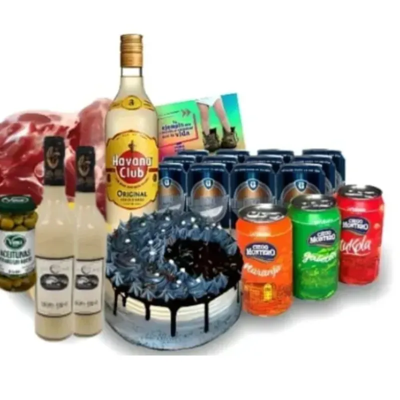 12 cervezas un unlaguer 1 botella de ron 5 libras de carne de cerdo limpia 2 crema de vie 1 Kake mediano 3 latas de refresco