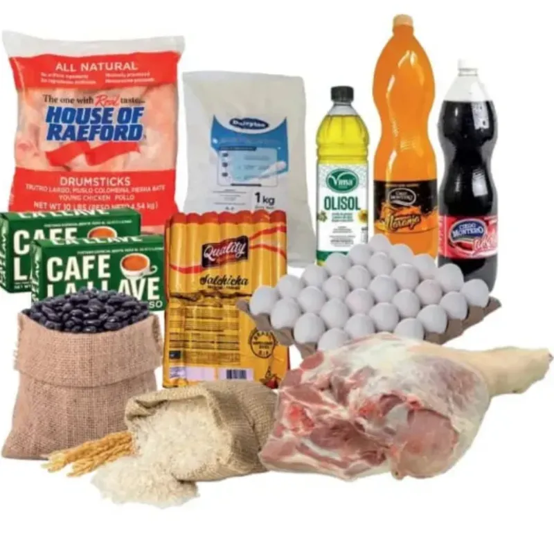 15 libras de carne de cerdo( lomo, cogote, paleta) 10 libras de pollo 1 cartón de huevo 2 pomos de aceite 1 bolsa de leche en polvo de 1 kg 20 libras de arroz 5 libras de frijoles negros de producción nacional 2 pomos de refresco de 1.5 litros 1 pata de ajo grande 1 paquete de salchichas de las grandes 1 kg 2 paquetes de café la llave Notas importantes: - Algunos productos pueden variar respecto a la foto, pero todos mantienen el precio y la calidad acordada