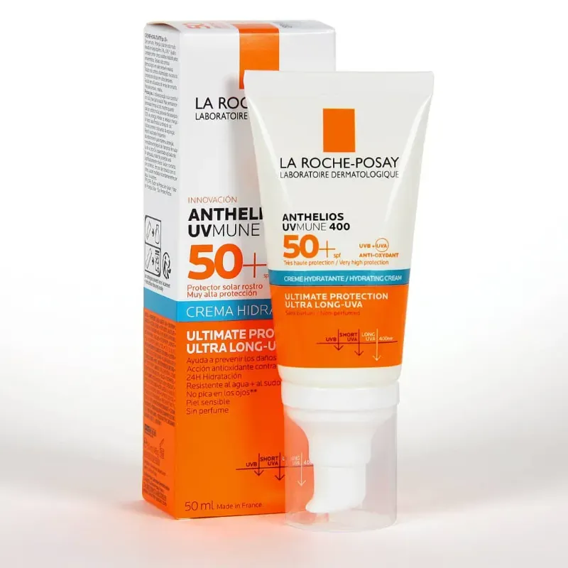 La Roche-Posay Anthelios UVMune 400 Crema Solar Hidratante SPF 50+ El protector solar hidratante SPF 50+ Anthelios UVMune 400 es una innovación de La Roche-Posay. Dedicada a las pieles sensibles e intolerantes al sol, garantiza una protección de amplio espectro muy alta. ¿Tienes la piel normal a seca y buscas un producto solar hidratante y eficaz? ¡La crema hidratante SPF 50+ UVMune 400 de la gama Anthelios satisfará sus necesidades! Este protector solar ofrece una protección de muy amplio espectro, ya que se dirige tanto a los rayos UVB como a los rayos UVA, incluidos los rayos UVA largos gracias a un sistema de filtro patentado, el Mexoryl 400.