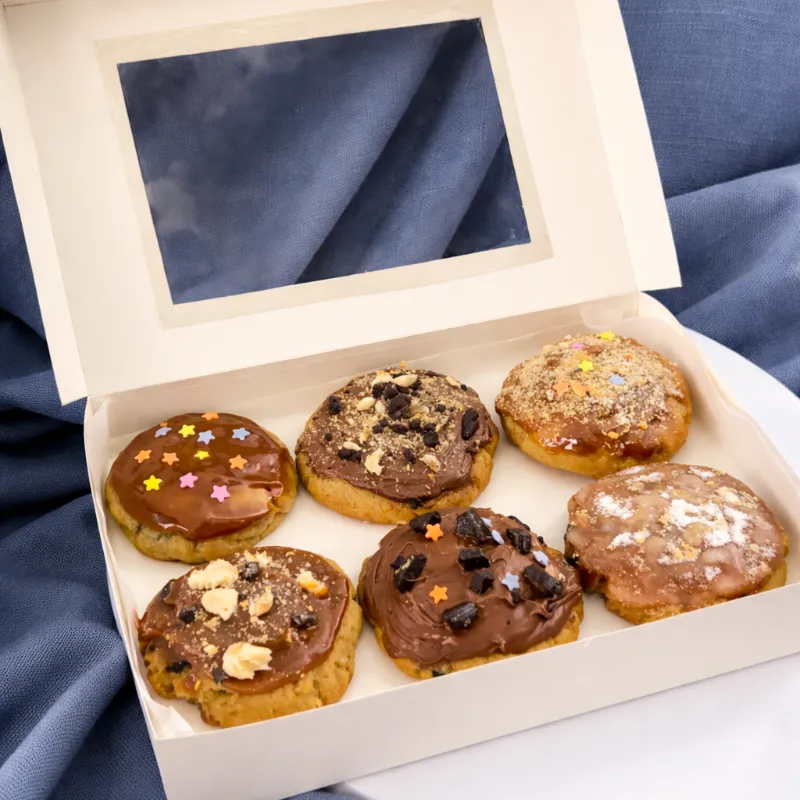 Caja de 6 cookies hechas 100% de mantequilla, pueden tener relleno de fanguito, crema de avellana y el topping queda a su elección según disponibilidad 🥠🍪.