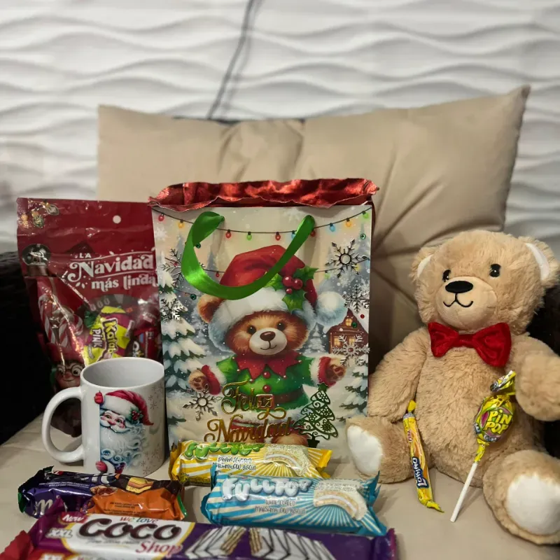 Contiene peluchito, jarra navideña, confituras y paquete con confituras