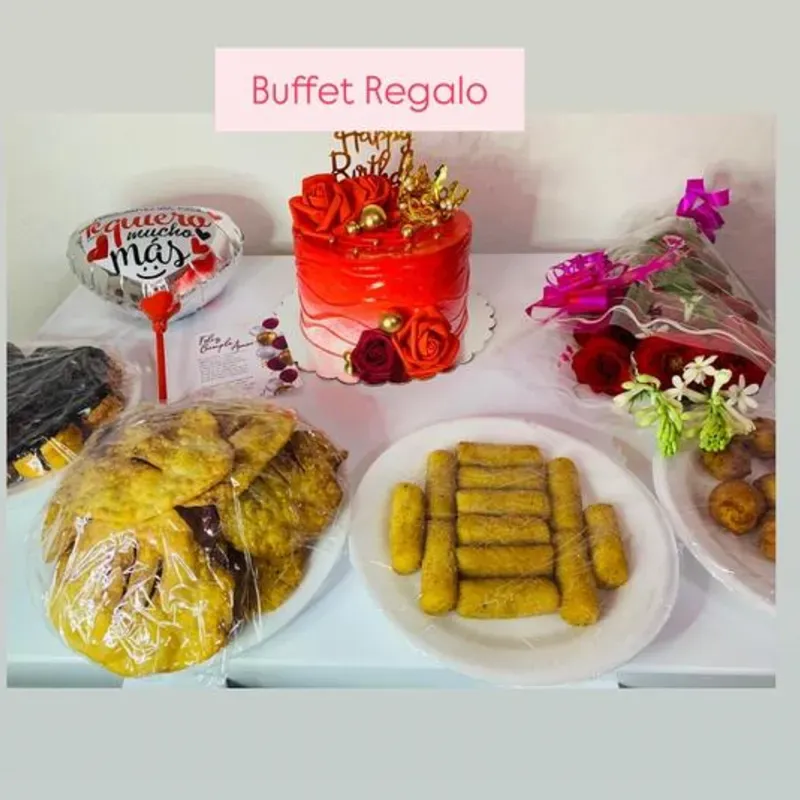 Cake 15 cm, 1 globo, 1 ramo de flores naturales, tarjeta de regalo, croquetas, empanadas, bolitas de queso, donas
