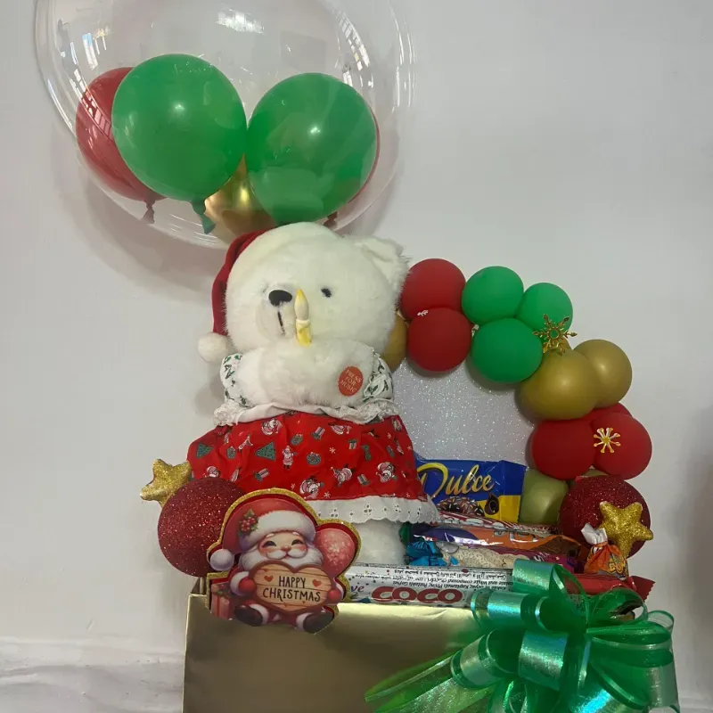 Contiene peluche, confituras, globo burbuja y adornos navideños Incluye animación de mamá Noela