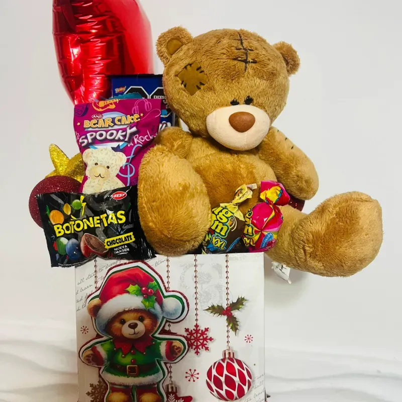 Contiene peluche, confituras y adornos navideños Incluye animación