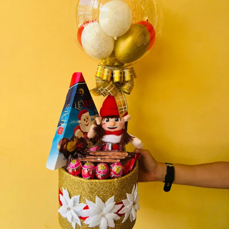 Contiene confituras, caja con bombones, gnomita y adirnos navideños Incluye animación