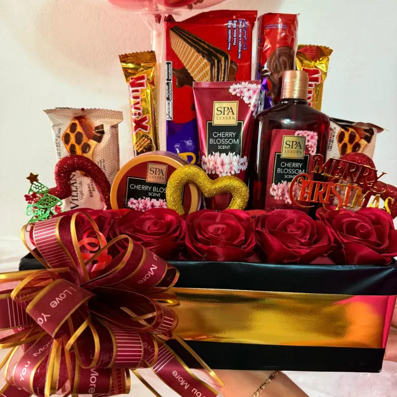 Contiene crema corporal, crema exfoliante, gel de baño, confituras, adornos navideños y detalles en rosas eternas Animación incluida de mamá Noela