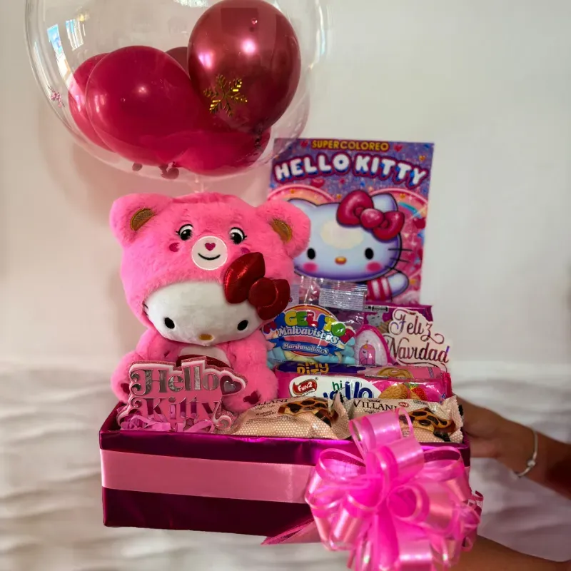 Contiene peluche de Hello Kitty, confituras, globo burbuja y adornos navideños Animación incluida de mamá Noela