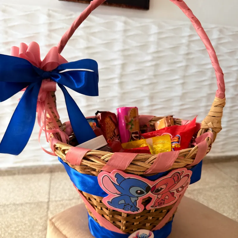 Hermosa cesta , con la temática de Stitch y Angela con una variedad de dulces personalizados .