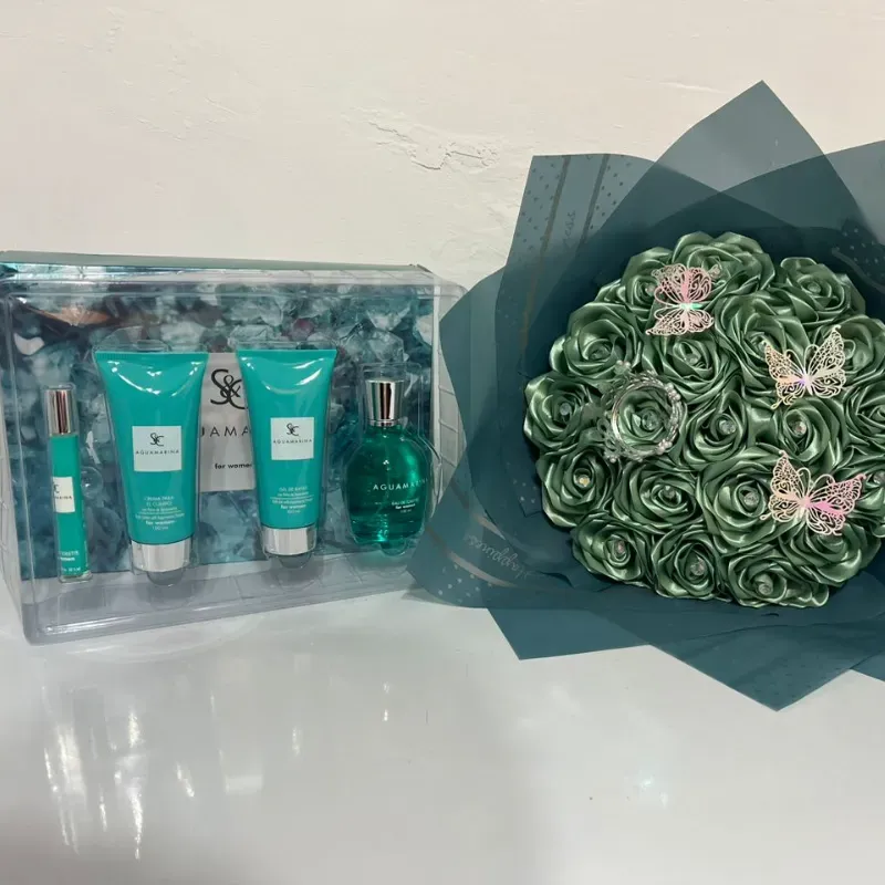 Contiene ramo buchón con corona, juego de colonia, perfume, crema corporación oral y gel de baño