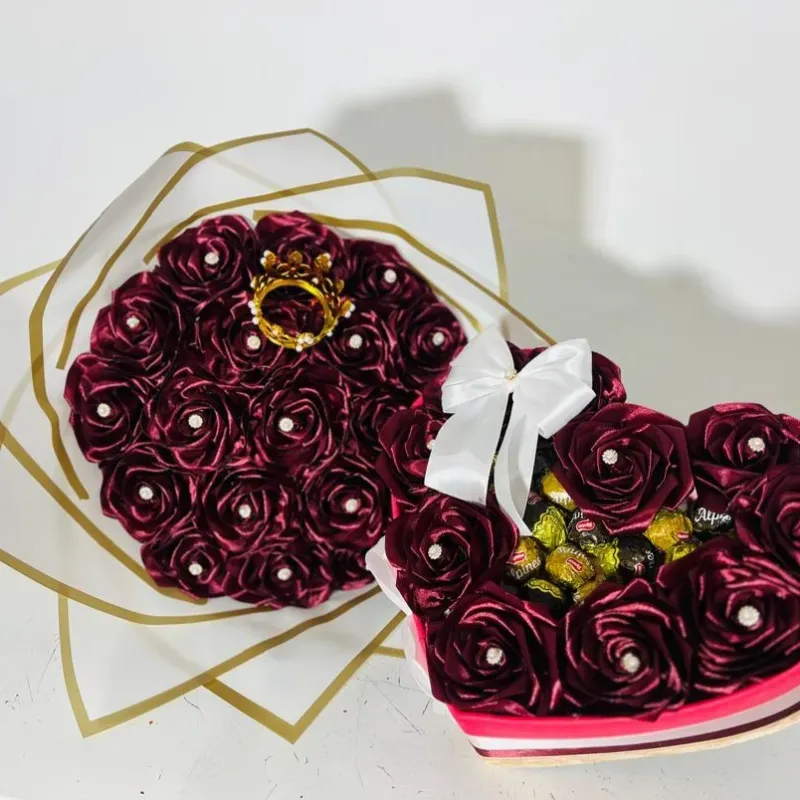 Juego de ramo buchón y ❤️ con bombones en rojo vino