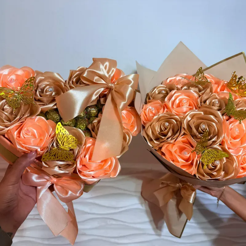 Juego de ramo buchón y corazón con bombones en dorado y naranja