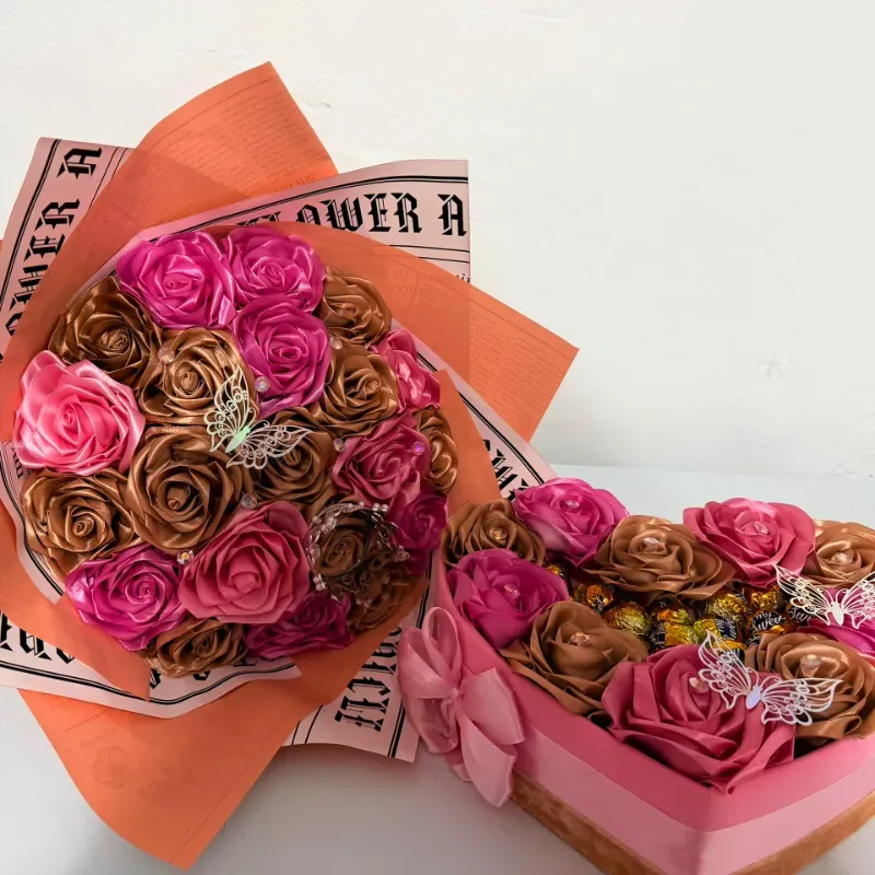 Juego de ramo y corazón con bombones en rosado y marrón