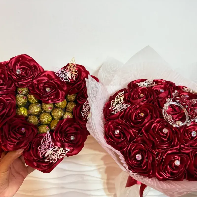 Ramo buchón con tiara y corazón con bombones en rojo