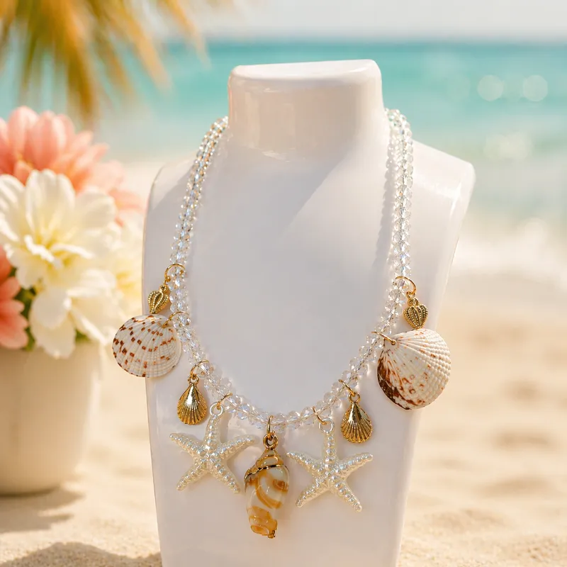 mezcla perlas con detalles de conchas y una estrella de mar que lo hace único.