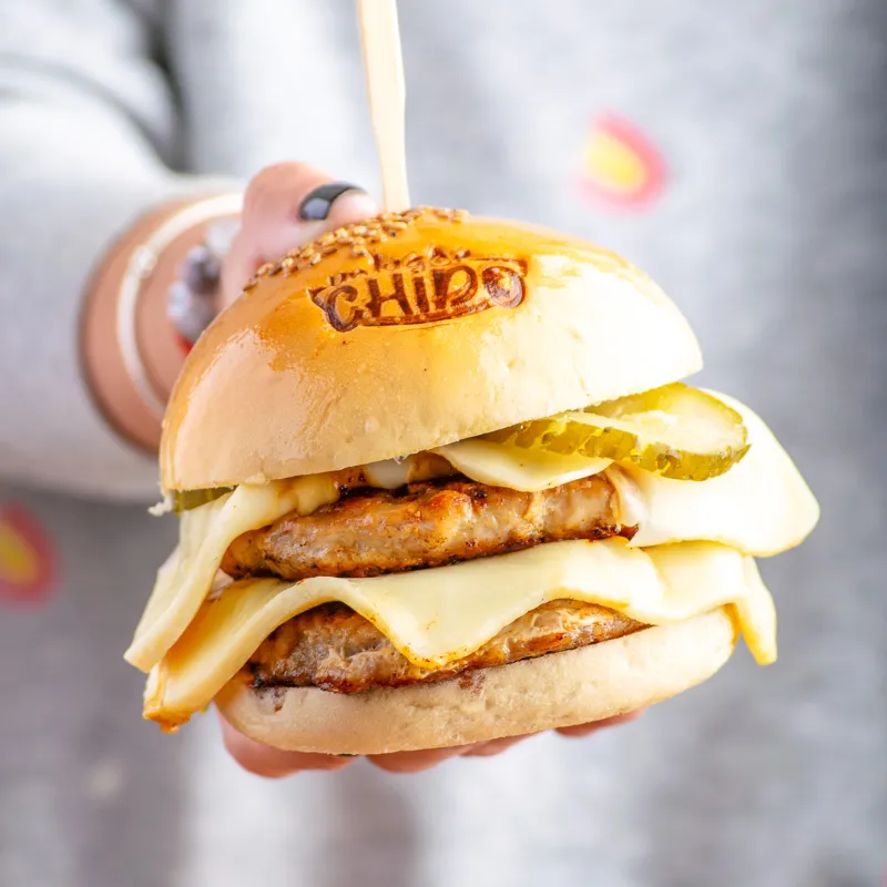 Hamburguesa doble de cerdo, queso y vegetal.