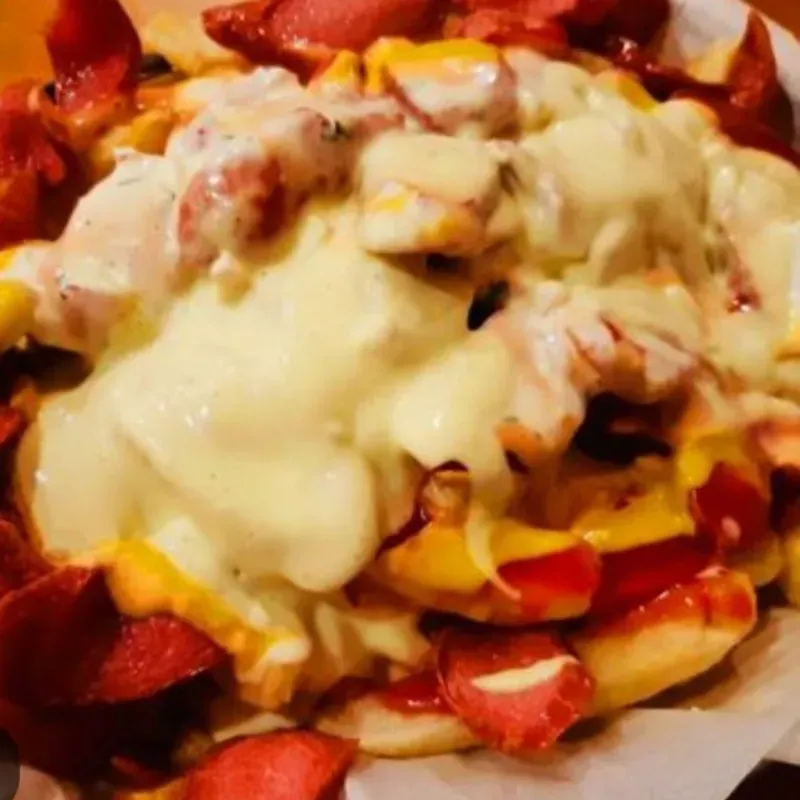 Exquisito plato con papas fritas (200g) y salchichas (150g) aderezadas con crema de queso