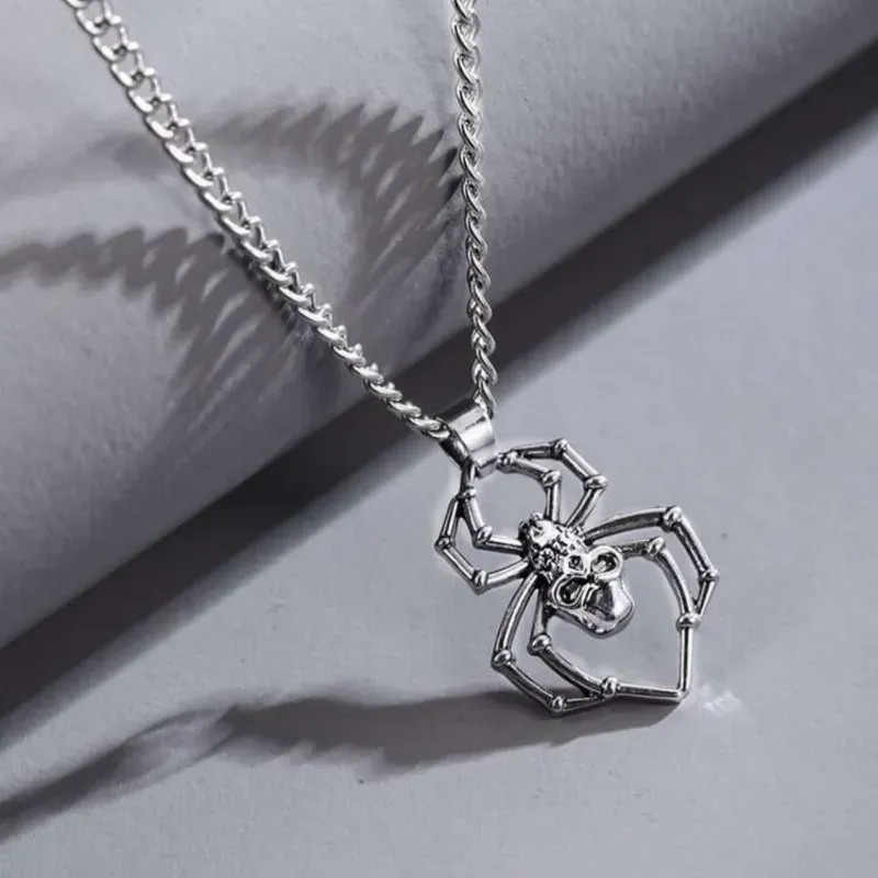Captura la esencia de lo gótico y lo moderno con el collar Viuda de Plata. Este colgante presenta una araña meticulosamente detallada con un diseño de calavera integrado en su abdomen, simbolizando el misterio y la resiliencia.