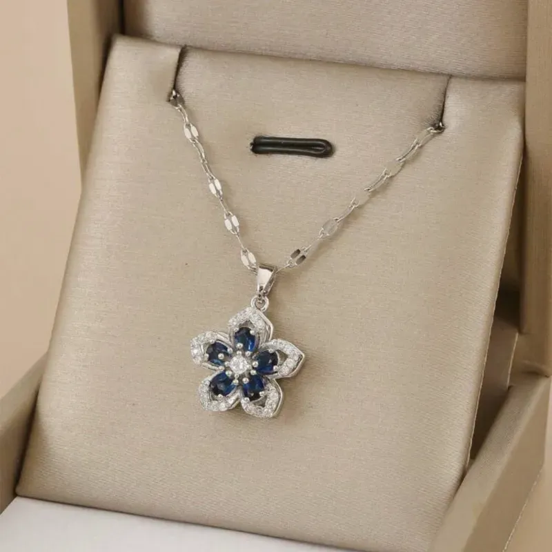 Eleva tu estilo con la sofisticación atemporal de nuestro collar Flor de Medianoche. Esta pieza artesanal captura la delicadeza de una flor en pleno florecimiento, combinando el brillo del cristal transparente con la profundidad del azul zafiro.