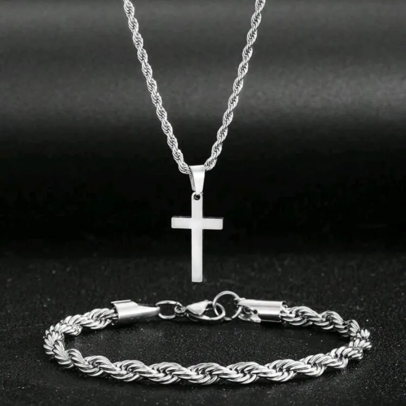 • Descripción: Un conjunto coordinado y sofisticado que es perfecto para el día a día. Incluye un collar de cadena de cuerda plateada con un colgante de cruz minimalista y pulido, y una pulsera de cuerda a juego para un look completo. Un diseño atemporal y elegante que expresa tu fe con estilo. El regalo perfecto para ti o para un ser querido.