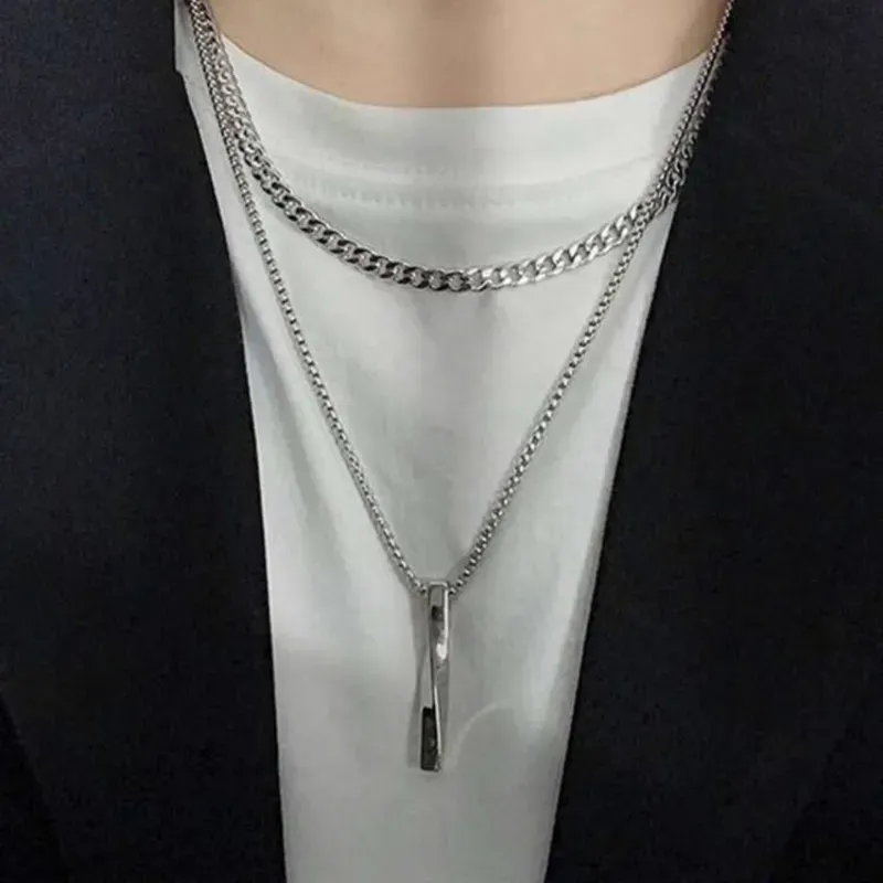 Define tu estilo con este set de doble capa diseñado para el hombre contemporáneo. Combina una cadena de eslabones estilo Curb de grosor medio con un collar más largo que luce un dije de barra torsional único. Su acabado en plata pulida aporta un brillo sutil pero potente, ideal para elevar un outfit casual o complementar un look formal con blazer.