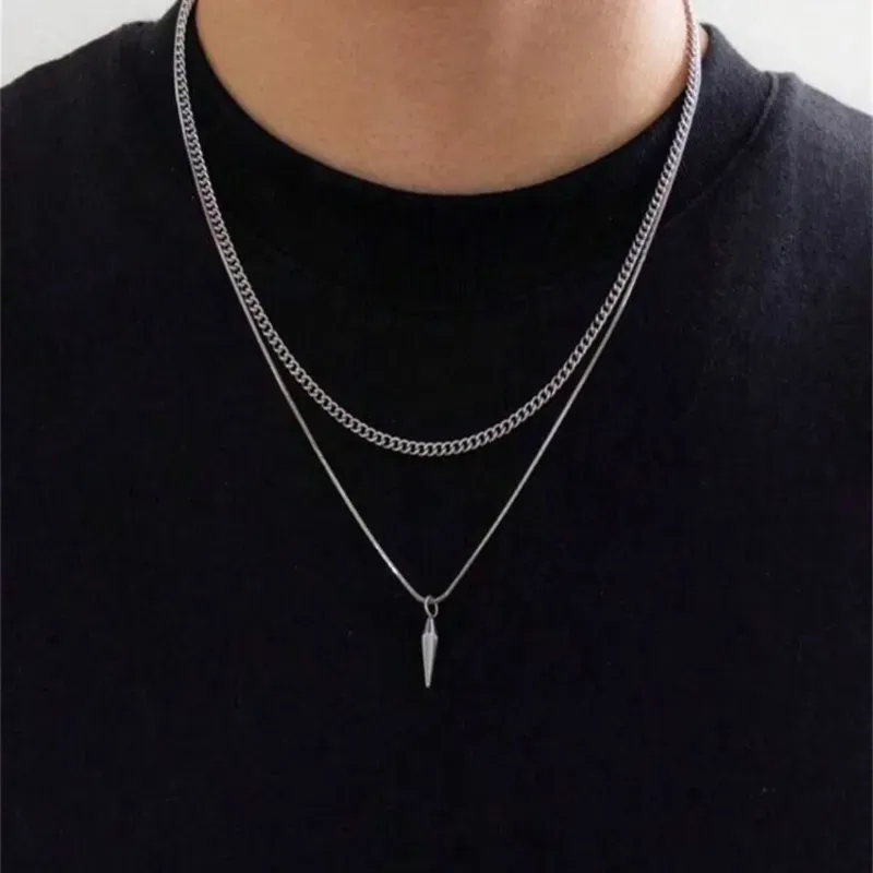 Consigue el look de capas perfecto con un solo accesorio. El set Dúo Punta de Lanza combina la robustez de una cadena clásica con la finura de un colgante minimalista, creando un equilibrio visual ideal para el hombre moderno.