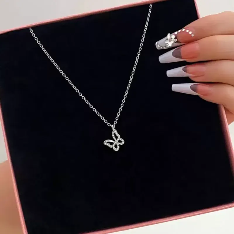Eleva tu estilo cotidiano con un toque de brillo eterno. Este delicado collar presenta un dije de mariposa calada, meticulosamente adornado con cristales de corte fino que capturan la luz desde cualquier ángulo. Su diseño en tono plata y cadena de eslabones finos lo convierte en la pieza perfecta para capas de joyería o para lucirlo solo como un detalle minimalista y chic.