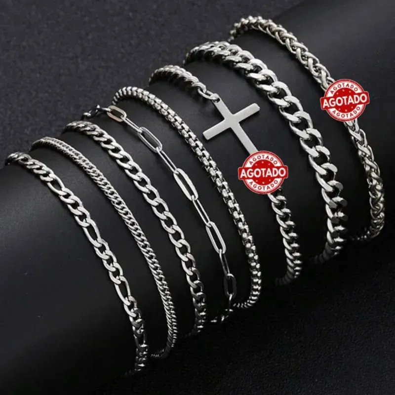 Domina el arte del layering con este set exclusivo de pulseras de cadena. Desde el clásico tejido Figaro y Grumet hasta eslabones rectangulares modernos y un dije de cruz minimalista, este conjunto ofrece texturas variadas para un look completo. Úsalas todas juntas para un estilo audaz o individualmente para un toque sutil y elegante.