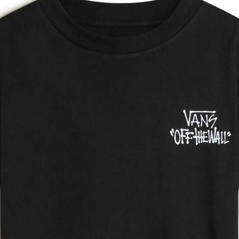 arte callejero y a la autenticidad sin filtros. Sobre una base de negro intenso, este diseño desplaza el icónico lema "Off The Wall" hacia un lateral del pecho, utilizando una tipografía de estilo scribble (garabato) que emula el trazo rápido de un marcador sobre el asfalto.