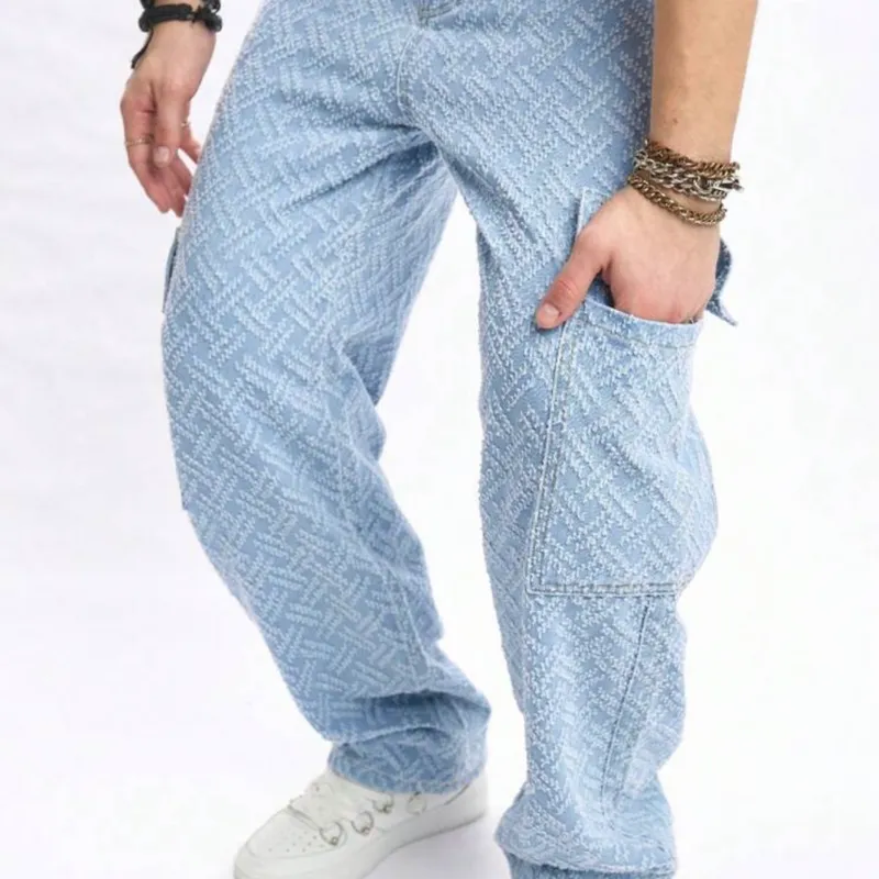 Manfinity EMRG Jeans de pierna ancha con bolsillo para hombres, pantalón cargo recto y liso de color azul claro lavado, para regalos de esposo o novio