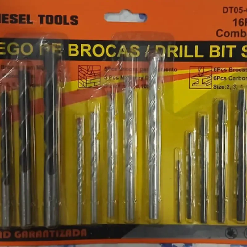 Set de barrenas MIXTO (brocas) Madera/Cemento( Tungsteno)/Metal 16 Barrenas -------Contiene----------- *5Pcs Brocas para Madera 5 Pcs Wood Drills Size : 4 , 5 , 6 , 8,10mm *5Pcs Brocas para Cemento 5 Pcs Masonry Drills Size : 4 , 5 , 6 , 8,10mm *6Pcs Brocas para Acero 6Pcs Carbon Steel Drills Size : 2 , 3 , 4 , 5 , 6 , 8mm