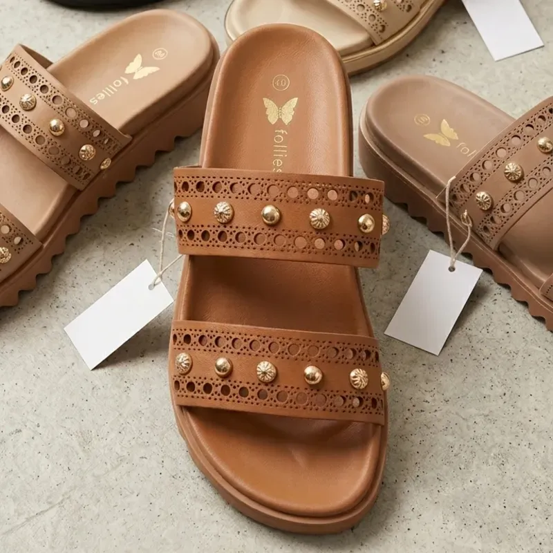 Sandalias tipo plataforma con chapas decorativas. Varios colores disponibles