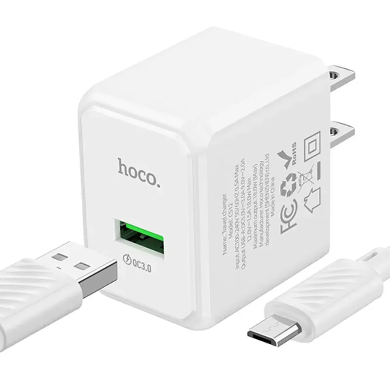 ⚡ Hoco CS12 Ocean: Cargador rápido USB-A con salida 18W (QC 3.0) y cable Micro USB de 1 metro. Compacto, seguro y perfecto para dispositivos clásicos. 🔋🚀