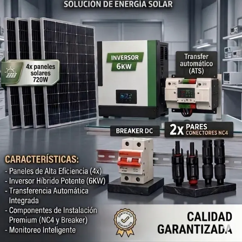 • Transferencia Automática (ATS): Olvídate de los cambios manuales. El sistema detecta cuando falta la red y cambia al modo solar automáticamente sin que tus equipos se apaguen.