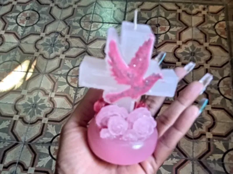 Vela de cruz con paloma en base de rosas