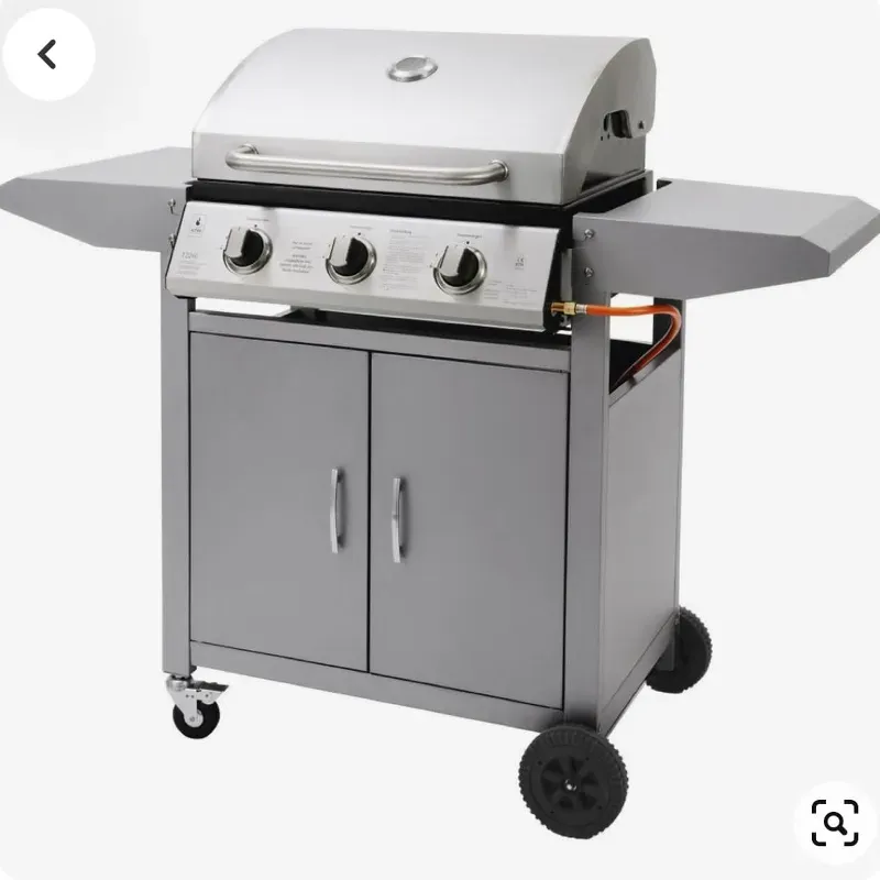 Parrilla de gas de acero inoxidable con tres quemadores.