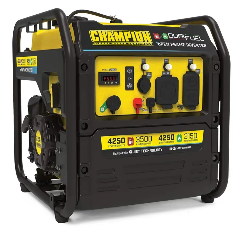 Características principales: Potencia: 4,250 W pico (arranque) 3,500 W continuos (con gasolina) Aproximadamente 3,150 W continuos con gas propano Inversor (energía estable para equipos electrónicos) Dual Fuel: gasolina y gas propano Tecnología silenciosa (Quiet Technology) Marco abierto portátil Ideal para RV, hogar y respaldo Cumple normas CARB/EPA Salidas: 1 × 120V 30A (RV Ready – TT-30R) 2 × 120V 20A (domésticas) 1 × 12V DC