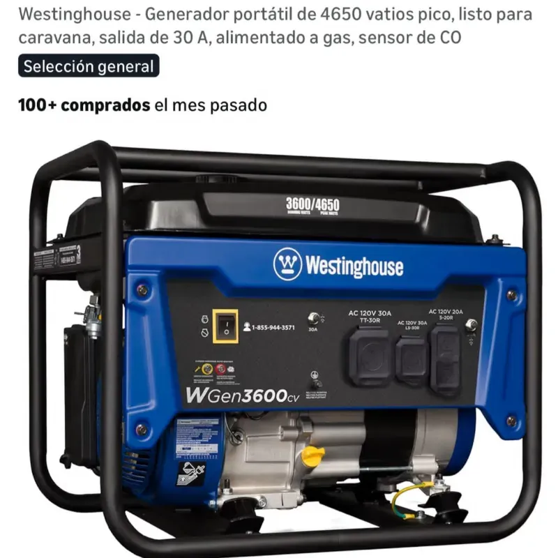 Westinghouse WGen3600cv): Características principales: Potencia: 3600 W continuos / 4650 W pico Motor a gasolina Sensor de CO (apaga el equipo si detecta monóxido de carbono) Listo para caravana (RV Ready) Arranque manual Regulación automática de voltaje (AVR) Estructura tubular resistente Salidas: 1 x 120V 30A TT-30R (caravana) 2 x 120V 20A (uso general)