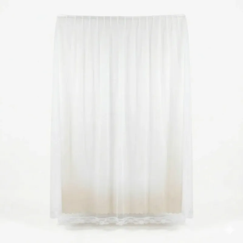 Capa exterior: Tul/malla translúcida (tipo voile) Capa interior: Tela con recubrimiento opaco (tipo blackout o semiblackout) Acabados: Encaje decorativo en borde inferior