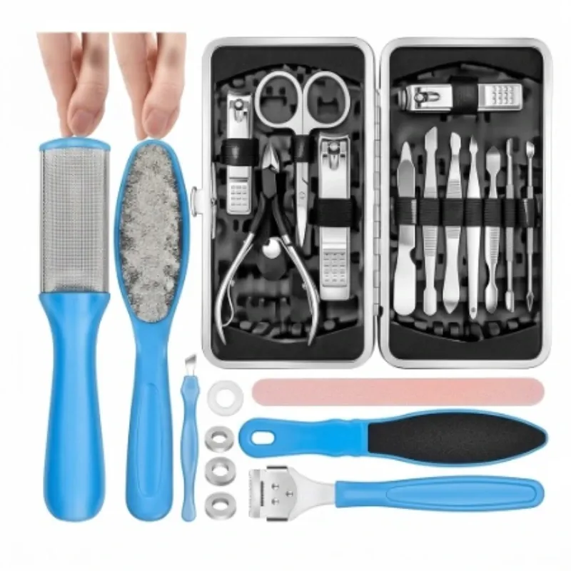 Raspadores/callus remover (grueso y fino) Lima doble cara para pies Removedor de durezas con cuchillas intercambiables Corta cutículas Herramienta para cutícula (empujador/limpiador) Cepillo pequeño de limpieza Separador de dedos Lima de uñas Cuchillas de repuesto Estuche compacto con: Cortauñas (varios tamaños) Tijeras Pinzas Limas metálicas Removedores de cutícula Herramientas de limpieza