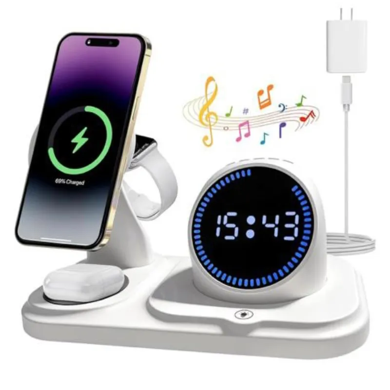 Estación de carga inalámbrica 6 en 1 con función de altavoz Bluetooth, soporte de carga para múltiples dispositivos para Apple iPhone 17 16 15 14 13 12 Pro Max Apple Watch Airpods, reloj digital